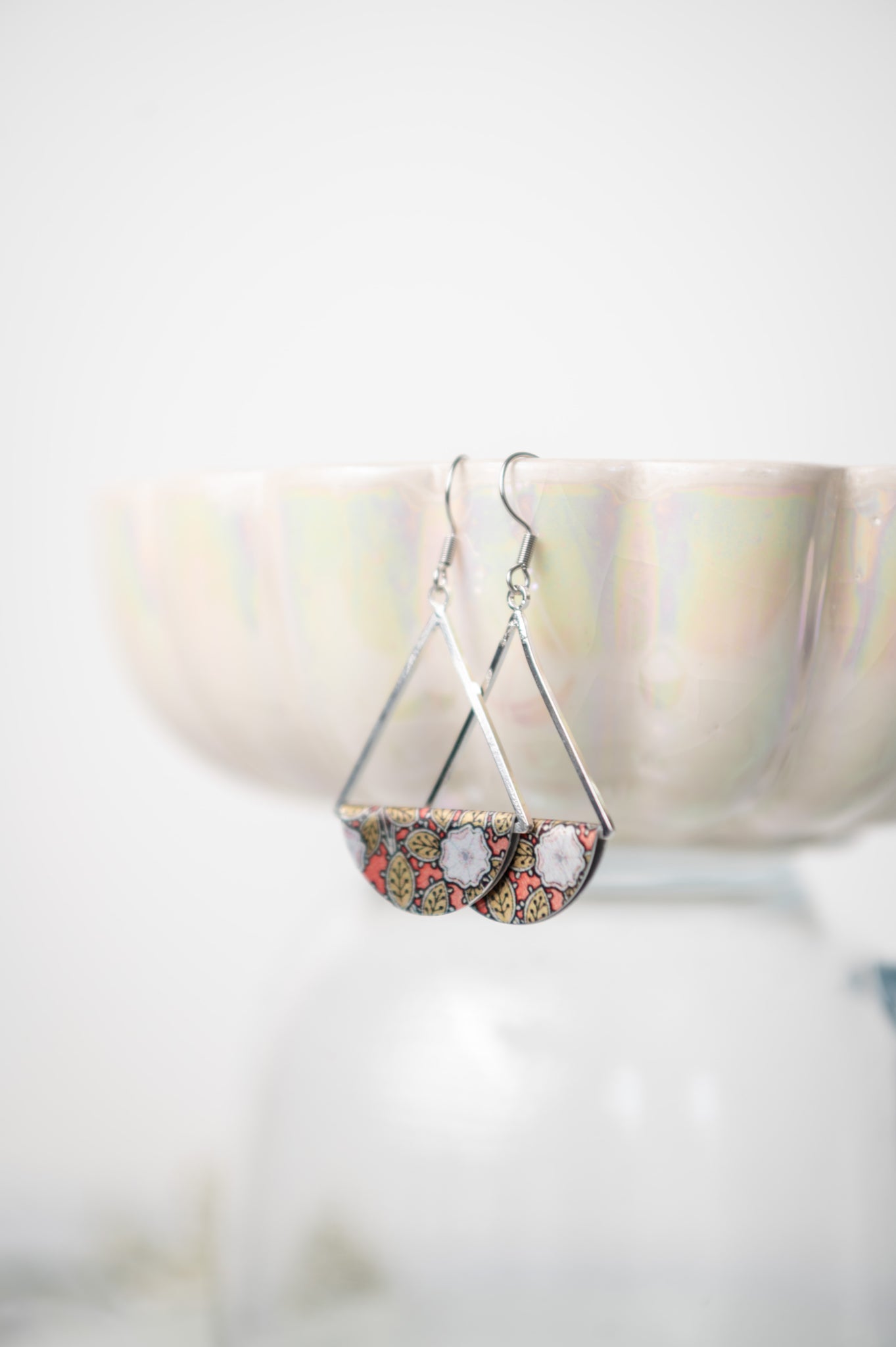 Lightweight and easy to wear, these dangle earrings feature a 1" patterned aluminum disc wrapped around a 1" triangle.
