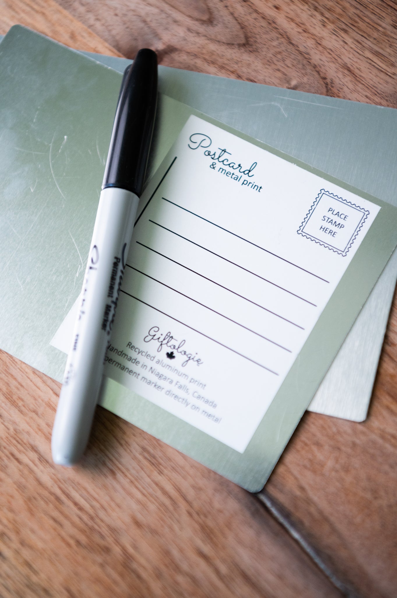 Postcard 4"X6" silver recycled aluminum, includes paper label for address. No special handling required; use regular postage. Message can be written directly on metal with permanent marker.