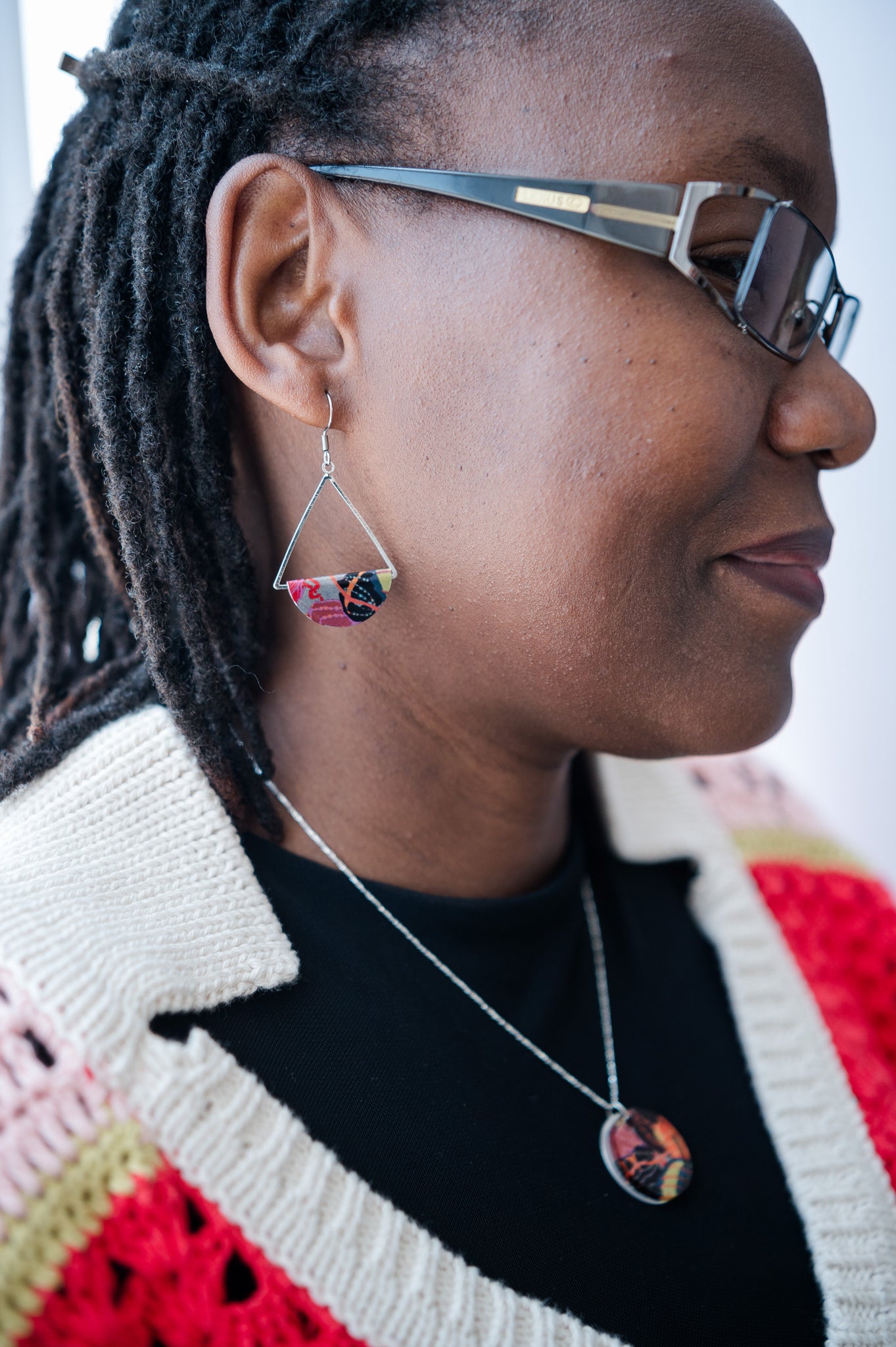 Lightweight and easy to wear, these dangle earrings feature a 1" patterned aluminum disc wrapped around a 1" triangle.