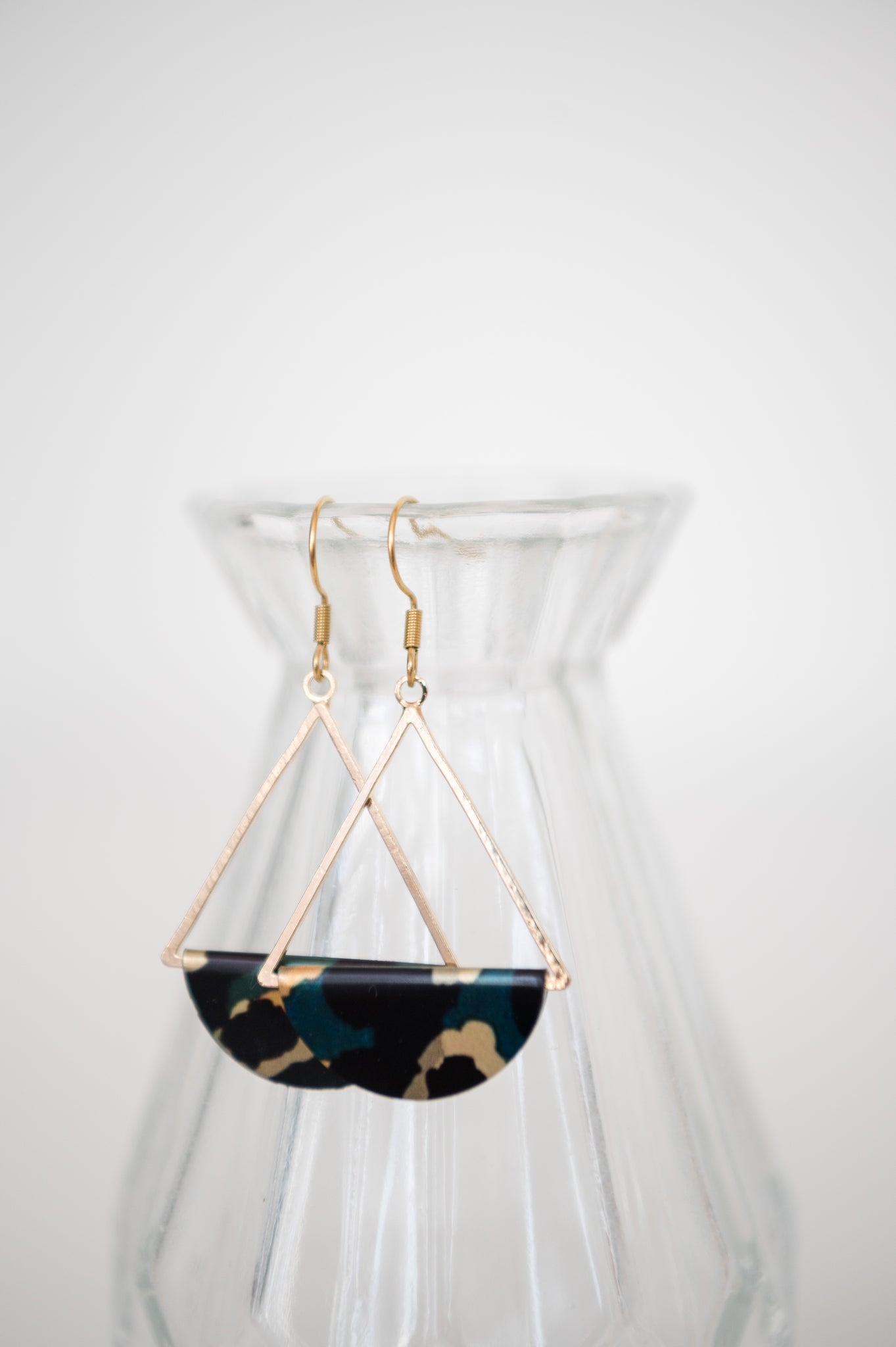 Lightweight and easy to wear, these dangle earrings feature a 1" patterned aluminum disc wrapped around a 1" triangle.